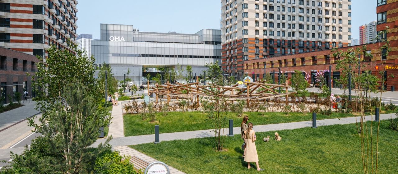 У проектов будет общая инфраструктура и благоустроенная территория. Уже открыта часть пешеходного бульвара. Здесь можно гулять после работы, играть с детьми, заниматься спортом и отдыхать у сухого фонтана с ночной подсветкой. В будущем в кластере появится пешеходный мост, который соединит жилые кварталы. Также на территории проекта работает современный центр ОМА. Для гостей и жителей здесь работают супермаркет, туристическое агентство, магазины товаров для дома и интерьерные студии. На верхнем этаже разместились рестораны с верандами, откуда открывается панорамный вид на уютный пешеходный бульвар с сухим фонтаном. Рядом — благоустроенная зелёная зона с амфитеатром.